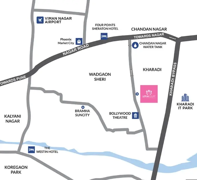Discover ready possession 2 & 3 BHK homes, located just 10 minutes from Kharadi IT Hub and close to Pune’s most sought-after areas — Koregaon Park, Kalyani Nagar, and Viman Nagar. Enjoy seamless access to the Airport (15 mins), Railway & Bus Stations along with nearby schools, hospitals, malls, and restaurants. Designed by award-winning architects, Lotus Court features two elegant 16-storey towers with smart layouts, ample natural light, podium-level amenities, and spacious parking, offering a lifestyle that blends comfort, connectivity, and class.
